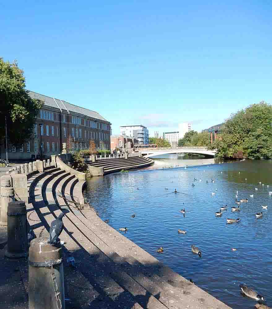 Begin in the heart of the Cathedral Quarter, strolling along one of Derby's most historic and picturesque streets. Cross the lively marketplace and head towards the gentle flow of the River Derwent. Walk alongside its serene waters for a time, then make your way across Cathedral Green. Continue on to the ancient Silk Mill, and finally, step away from the city’s bustle to end at a tranquil, beautifully designed church.